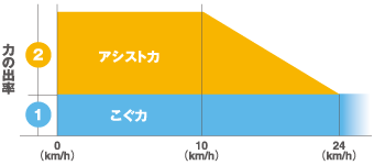 そして、時速10Kmを超えると次第に弱まって、時速24kmでアシストはゼロになり通常